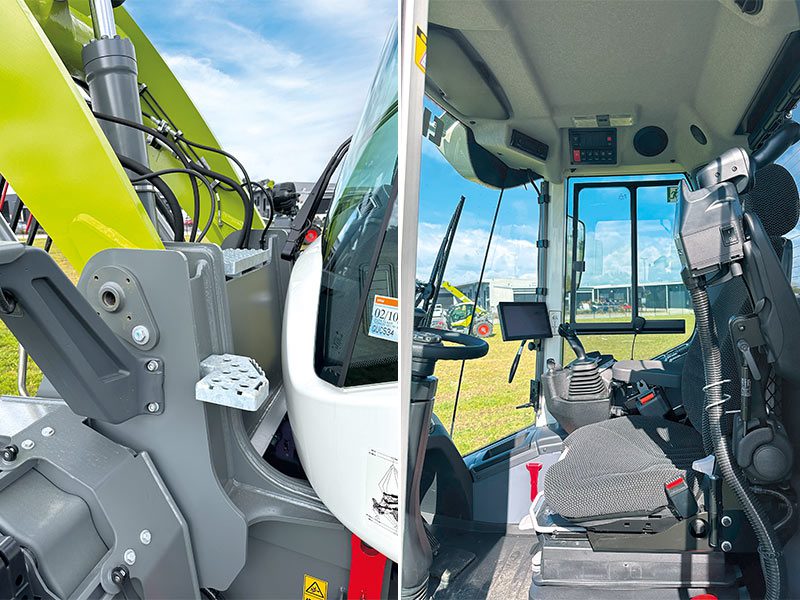 Easy-to-access steps and a rear opening door made it easy to get into the machine. A great feature is the steps all the way around the front and both sides, super handy for access to clean windows, etc. If accustomed to an agricultural boom, one of the first things people are likely to notice is the Z bar (called the Z-kinematics in this case). This offers some positives; the Z bar is more universal as a second life for the machine after contractors have moved away from doing silage, or can be utilised in winter (for loading metal for example) with its higher breakout force (12-tonne in this case).