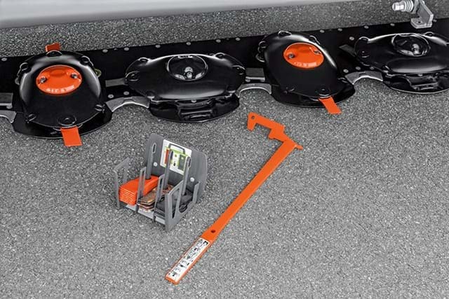 The safety link safety module ensures each cutting disc is protected by a pre-determined breaking point, isolating it from the drive train in the event of contact with a foreign body. An axial bolt holds the cutting disc firmly in place to prevent it flying off if it breaks. The specially-hardened intermediate pieces are shaped differently for the mower discs that converge and diverge for a clean cut and maximum overlap.